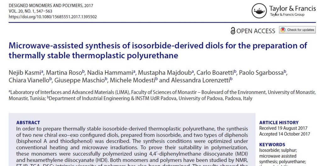 [4] N. Kasmi, M. Roso, N. Hammami, M. Majdoub, C. Boaretti, P. Sgarbossa, C. Vianello, G. Maschio, M. Modesti, A. Lorenzetti*. Microwave-assisted synthesis of isosorbide-derived diols for the preparation of thermally stable thermoplastic polyurethane, Designed Monomers and Polymers. 2017, 20, 547-563. LINK (CiteScore “2019”: 3.7)