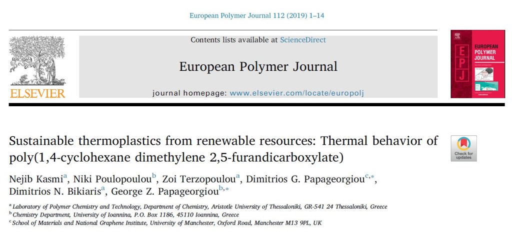 [15] N. Kasmi, N. Poulopoulou, Z. Terzopoulou, D.G. Papageorgiou*, D.N. Bikiaris, G.Z. Papageorgiou*. Sustainable Thermoplastics from Renewable Resources: Thermal behavior of Poly(1,4-cyclohexane dimethylene 2,5-furandicarboxylate), European Polymer Journal. 2019, 112, 1-14. LINK (IF “2021”: 5.546)