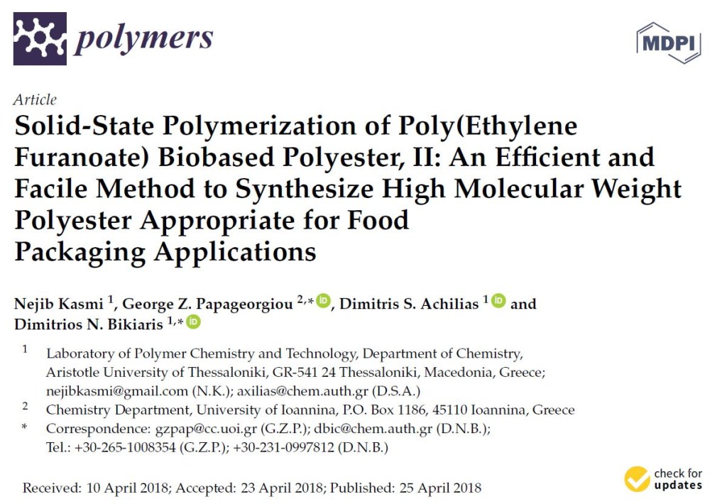[8] N. Kasmi, G.Z. Papageorgiou*, D.S. Achilias, D.N. Bikiaris*. Solid-State Polymerization of Poly(Ethylene Furanoate) Biobased Polyester, II: An Efficient and Facile Method to Synthesize High Molecular Weight Polyester Appropriate for Food Packaging Applications, Polymers. 2018, 10, 471. LINK (This article belongs to the Special Issue Polymers from Renewable Resources) (IF “2021”: 4.967)