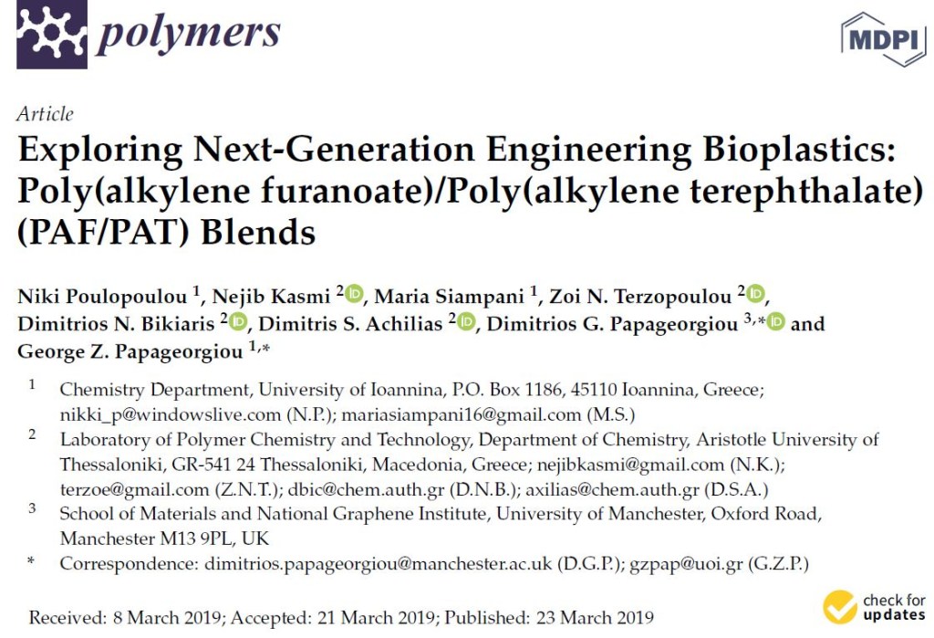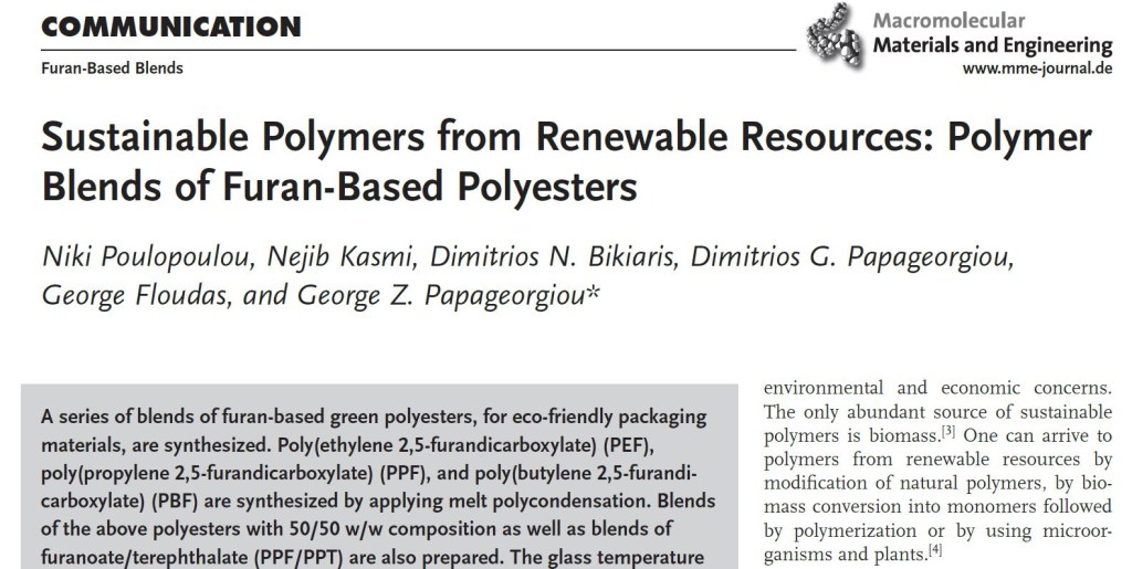 [6] N. Poulopoulou, N. Kasmi, D.N. Bikiaris, D.G. Papageorgiou, G. Floudas, G.Z. Papageorgiou*. Sustainable polymers from renewable resources: Polymer blends of furan-based polyesters, Macromolecular Materials and Engineering. 2018, 1800153. LINK (IF “2021”: 4.402)