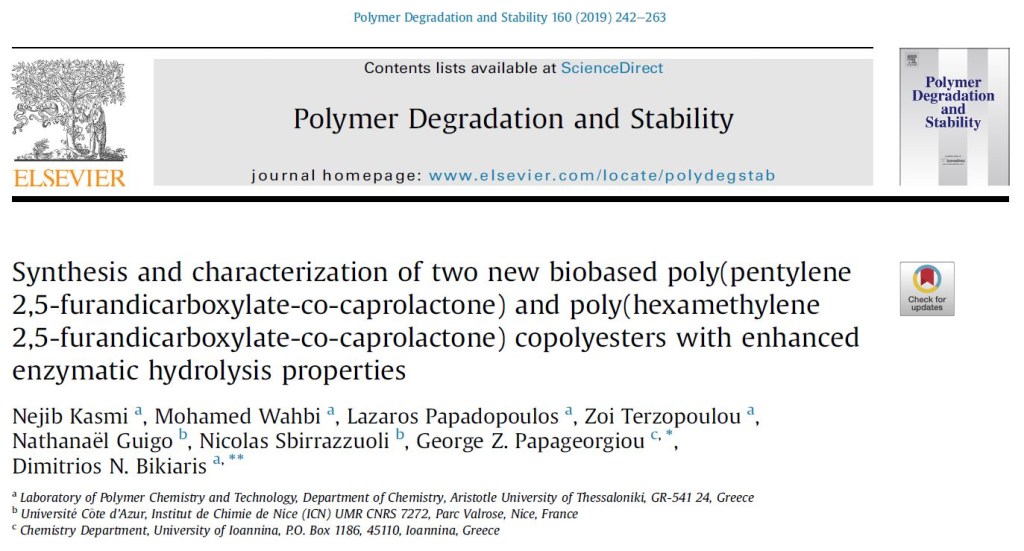 [16] N. Kasmi, M. Wahbi, L. Papadopoulos, Z. Terzopoulou, N. Guigo, N. Sbirrazzuoli, G.Z. Papageorgiou*. D.N. Bikiaris*. Synthesis and characterization of two new biobased poly(pentylene 2,5-furandicarboxylate-co-caprolactone) and poly(hexamethylene 2,5-furandicarboxylate-co-caprolactone) copolyesters with enhanced enzymatic hydrolysis properties. Polymer Degradation and Stability. 2019, 160, 242- 263. LINK (IF “2021”: 5.204)