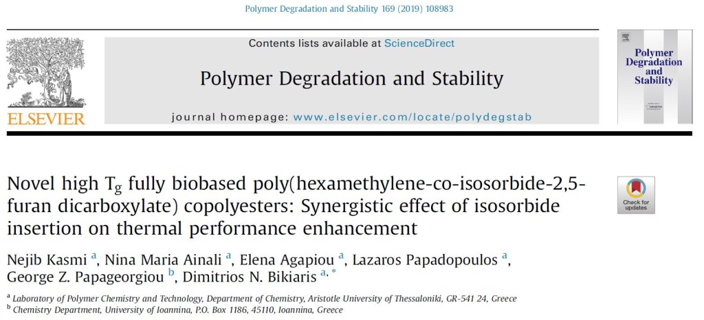 [17] N. Kasmi, N. Ainali, E. Agapiou, L. Papadopoulos, G.Z. Papageorgiou. D.N. Bikiaris*. Novel High Tg fully biobased poly(hexamethylene-co-isosorbide-2,5-furan dicarboxylate) Copolyesters: Synergistic Effect of Isosorbide Insertion on Thermal performance Enhancement. Polymer Degradation and Stability. 2019. LINK (IF “2021”: 5.204)