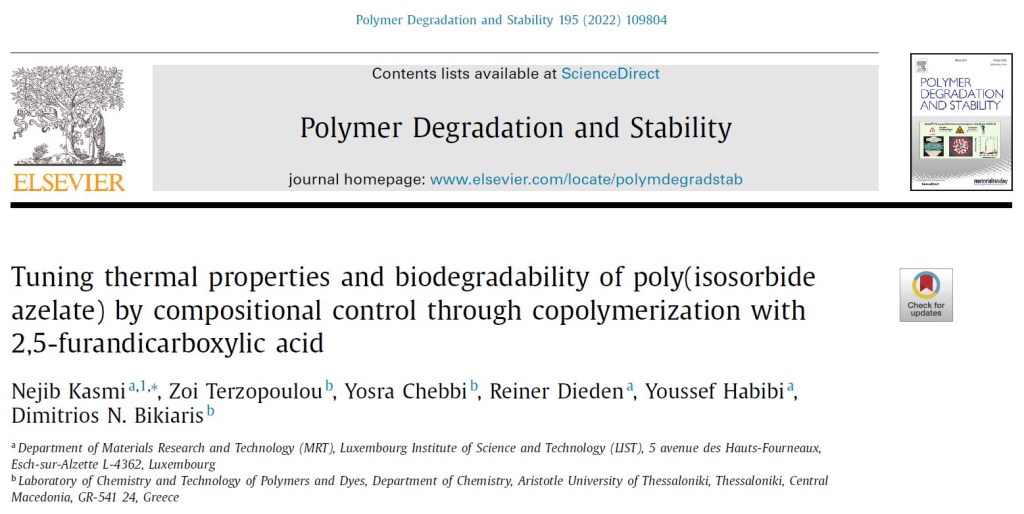 [24] N. Kasmi*, Z. Terzopoulou, Y. Chebbi, R. Dieden, Y. Habibi, D. N. Bikiaris. Tuning thermal properties and biodegradability of poly(isosorbide azelate) by compositional control through copolymerization with 2,5-furandicarboxylic acid. Polymer Degradation and Stability 2022, 195, 109804 (IF “2021”: 5.204) LINK