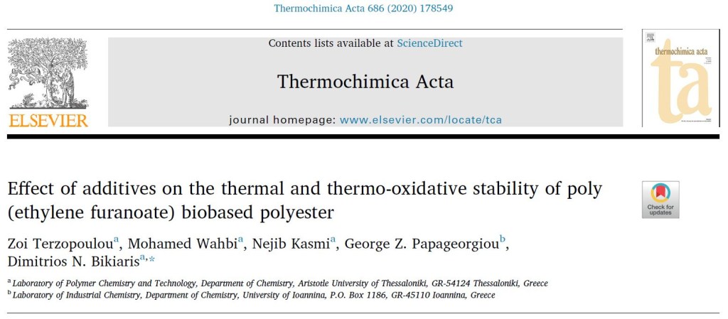 [18] Z. Terzopoulou, M. Wahbi, N. Kasmi, G.Z. Papageorgiou. D.N. Bikiaris*. Effect of additives on the thermal and thermo-oxidative stability of poly(ethylene furanoate) biobased polyester. Thermochimica Acta. 2020, 686, 178549. LINK (IF “2021”: 3.378)