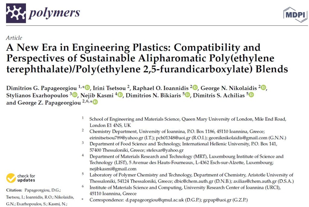 [23] D. G. Papageorgiou*, I. Tsetsou, R. O. Ioannidis, G. Nikolaidis, S. Exarhopoulos, N. Kasmi, D. N. Bikiaris, D. Achilias, G. Z. Papageorgiou*. A new era in engineering plastics: compatibility and perspectives of sustainable alipharomatic poly(ethylene terephthalate)/poly(ethylene 2,5-furandicarboxylate) blends. Polymers 2021, 13(7), 1070 ( IF “2021”: 4.967) LINK