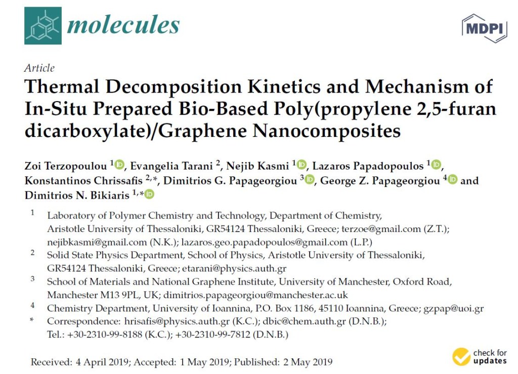 [10] Z. Terzopoulou, E. Tarani, N. Kasmi, L. Papadopoulos, K. Chrissafis*, D.G. Papageorgiou, G.Z. Papageorgiou, D.N. Bikiaris*. Thermal Decomposition Kinetics and Mechanism of In-Situ Prepared Bio-Based Poly(propylene 2,5-furan dicarboxylate)/ Graphene Nanocomposites. Molecules. 2019, 24(9), 1717. LINK (IF “2021”:4.927)