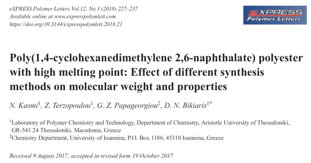 [7] N. Kasmi, Z. Terzopoulou, G.Z. Papageorgiou, D.N. Bikiaris*. Poly(1,4-cyclohexanedimethylene 2,6-naphthalate) polyester with high melting point: effect of different synthesis methods on molecular weight and properties, eXPRESS Polymer Letters. 2018, 12, 227-237. LINK (IF “2020”: 4.161)