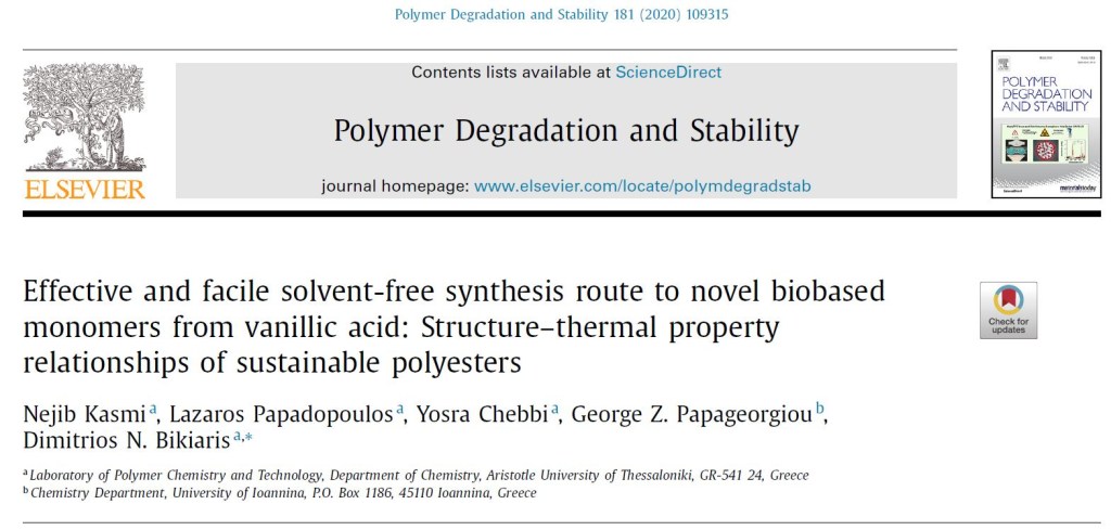[20] N. Kasmi, L. Papadopoulos, Y. Chebbi, G.Z. Papageorgiou, D.N. Bikiaris*. Effective and facile solvent-free synthesis route to novel biobased monomers from vanillic acid: structureโthermal property relationships of sustainable polyesters. Polymer Degradation and Stability. 2020, 181, 109315. LINK (IF “2021”: 5.204)
