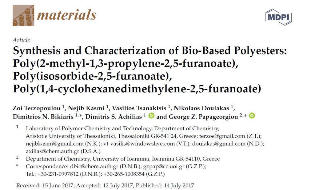 [3] Z. Terzopoulou, N. Kasmi, V. Tsanaktsis, N. Doulakas, D.N. Bikiaris*, D.S. Achilias, G.Z. Papageorgiou*. Synthesis and Characterization of Bio-Based Polyesters: Poly(2-methyl-1,3-propylene-2,5-furanoate), Poly(isosorbide-2,5-furanoate), Poly(1,4-cyclohexane dimethylene-2,5-furanoate), Materials. 2017, 10, 801. LINK (This article belongs to the Special Issue Biobased Polymers for Packaging Applications) (IF “2021”: 3.748)