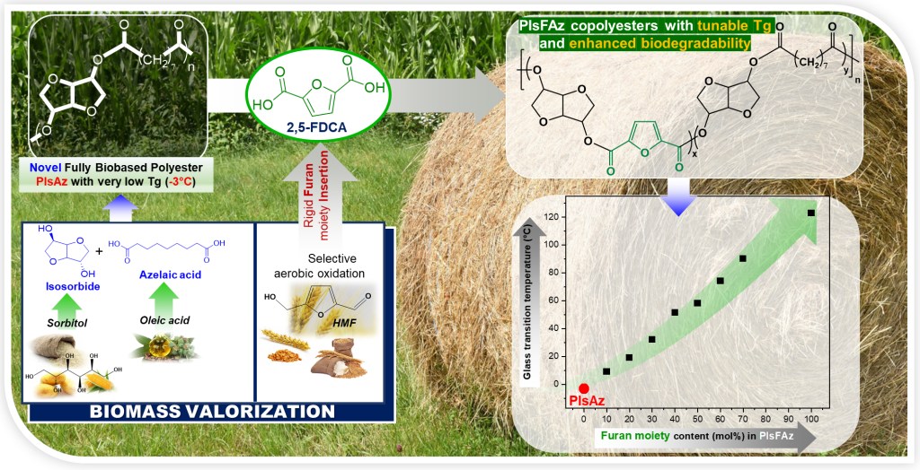 Abstract: A new fully biobased poly(isosorbide furanoate-co-azelate) (PISFAz) copolyesters series was synthesized through melt polycondensation. Incorporation of 2,5-furandicarboxylic acid (FDCA), a rigid comonomer, at different molar ratios in poly(isosorbide-azelate) homopolymer led to tuning of the thermal properties and biodegradability of the resulting copolyesters. The PISFAz copolyesters with various FDCA molar content spanning from 10 to 70% were prepared and characterized by FTIR, GPC, 1D/2D NMR and viscosity measurements. It was found that PISFAz were totally amorphous materials with high thermal stability. NMR results indicated that random microstructures were obtained for the prepared copolymers with high azelaic acid content (โฉพ 60 mol%). Most notably, the inclusion of FDCA units into the copolymer molecular chains induced a significant increase in the glass transition temperatures (Tg) that varied from 9.2 to 91.1ยฐC depending on FDCA content, leading to copolyesters with tunable Tg over a wide temperature window. The enzymatic hydrolysis behavior of PISFAz was assessed using lipases from Pseudomonas cepacia and Rhizopus oryzae revealing different susceptibility to enzymatic attack depending on the comonomer ratio, with a maximum degradation rate up to 61% after 30 days. These novel furanoate-based copolyesters show great potential to serve as promising green thermoplastic materials for applications requiring high Tg values.