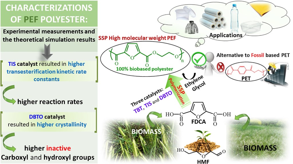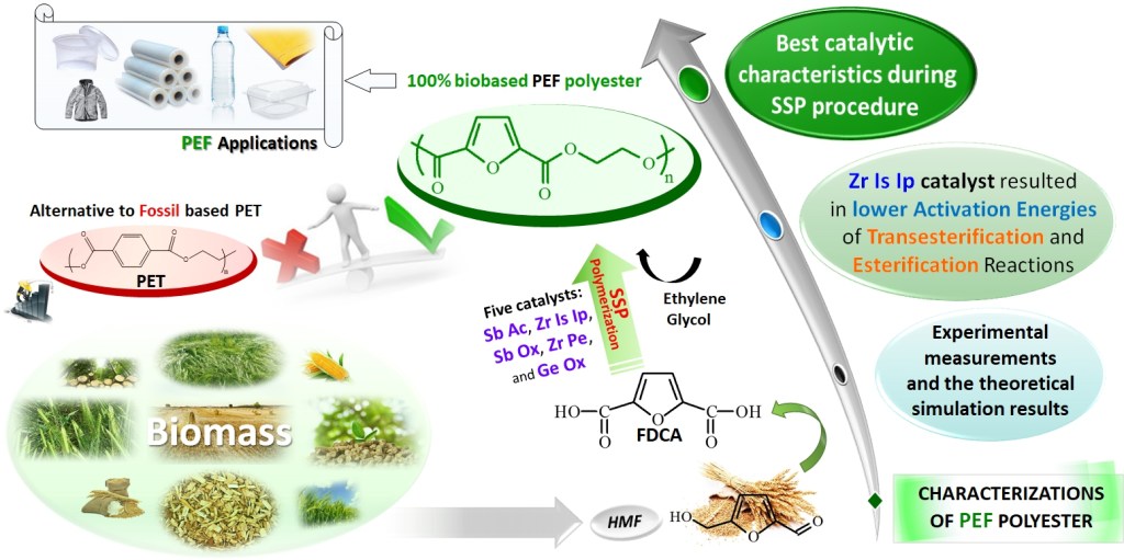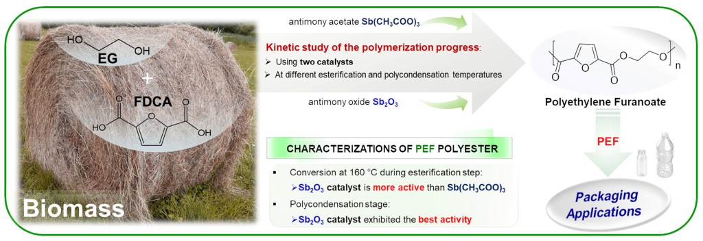 Abstract: In the last decades, the interest in the synthesis and development of novel biobased polymers with interesting properties, able to compete with the existing petroleum-based polymers has grown exponentially. 2,5-furandicarboxylic acid (FDCA) and poly(ethylene furanoate) (PEF) are the leaders of biobased aromatic polymers. However, the production of PEF by the direct esterification of FDCA with ethylene glycol (EG) has been shadowed by the transesterification of dimethyl 2,5-furandicarboxylate. Herein, we present the kinetic study of the polymerization progress of high-purity FDCA with EG using two different antimony catalysts (antimony oxide, Sb2O3, and antimony acetate, Sb(CH3COO)3) and different esterification and polycondensation temperatures by the traditional two-step polycondensation method. Each step was monitored by suitable characterization techniques, such as intrinsic viscosity measurements, carboxylic acid end-group analysis, nuclear magnetic resonance spectroscopy, infra-red spectroscopy and differential scanning calorimetry. Further insight into the esterification step, was given by high resolution mass spectrometry enabling the accurate mass measurement of the oligomers. Finally, theoretical studies were conducted to estimate the kinetics of the polymerization of PEF during esterification and polycondensation stages.