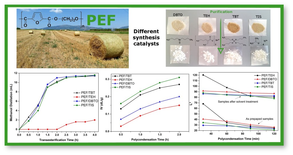 Abstract: In this work, the effect of the catalysts tetrabutyl titanate(IV) (TBT), titanium(IV) isopropoxide (TIS), tin(II) 2-ethylhexanoate (TEH) and dibutyltin(IV) oxide (DBTO) on the synthesis of poly(ethylene furanoate) (PEF) was studied during a two-stage melt polycondensation process. In all reactions, 2,5-dimethylfuran-dicarboxylate (DMFD) and ethylene glycol (EG) in 1โ:โ2 molar ratios, and 400 ppm of catalyst were used. The rate of the transesterification reaction (first stage) was evaluated by measuring the volume of the distilled methanol and for the polycondensation reaction (second stage) by the increase of intrinsic viscosity. For the first stage, all catalysts had a similar effect to methanol distillation, except for TEH which was found to be the slowest catalyst, while for the second stage TIS and TBT were found to be the most effective catalysts, followed by DBTO and TEH, which again had the lowest reactivity. Coloration of the prepared polyesters was measured using the L*a*b* colour space system and was found to be dependent on catalyst type and melt polycondensation time, with titanate catalysts yielding the highest coloration. White coloured polyesters can be obtained after dissolution in trifluroacetic acid and chloroform mixture, and precipitation in methanol. Decomposition by-products formed throughout the different processes were identified in solution and elucidated by using liquid chromatography high resolution mass spectrometry (LC-HRMS). Similar decomposition products were detected in all chromatographs and therefore concentration in samples prepared with titanate catalysts might be the cause of the higher colour intensity of these samples.