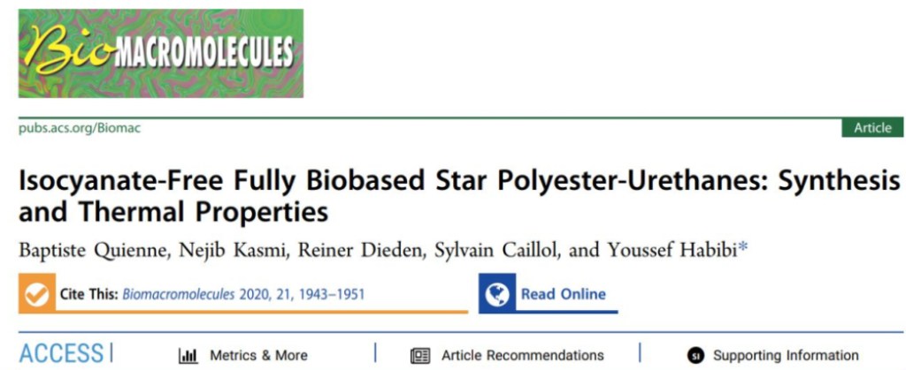 [19] B. Quienne, N. Kasmi, R. Dieden, S. Caillol, Y. Habibi*. Isocyanate-free fully biobased star polyester-urethanes: synthesis and thermal properties. Biomacromolecules, 2020, 21, 5, 1943-1951. LINK (IF “2020”: 6.988)