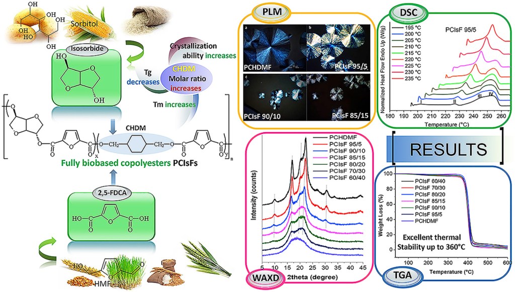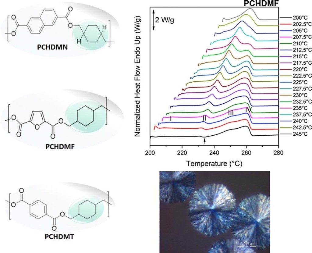 Abstract: Poly(1,4-cyclohexane dimethylene 2,5-furandicarboxylate) (PCHDMF) is a sustainable thermoplastic that can be prepared from renewable resources with potential uses as a replacement for its terephthalate (PCHDMT) and naphthalate (PCHDMN) analogues. A detailed study has been undertaken to assess its thermal behavior and chemical/structural characteristics, in comparison to its counterparts. The melting temperature of PCHDMF was observed at Tmโฏ=โฏ264.5โฏยฐC, the glass transition was obtained at 77โฏยฐC and the cold crystallization temperature was seen at 121โฏยฐC. The melting of the polymers was studied under a variety of conditions and all samples displayed the characteristic melting-recrystallization-remelting behavior. Isothermal and dynamic crystallization tests revealed that PCHDMF crystallizes at faster rates than its analogues, while the equilibrium melting point of PCHDMF was established at 300โฏยฐC. The enthalpy of fusion values for the polyesters were found ฮHmโฏ=โฏ137โฏJ/g for PCHDMF, ฮHmโฏ=โฏ108โฏJ/g for PCHDMT, ฮHmโฏ=โฏ119โฏJ/g for PCHDMN. Using the Lauritzen-Hoffman analysis of spherulite growth rates, larger Kg values were found for PCHDMF, due to its less flexible structure.