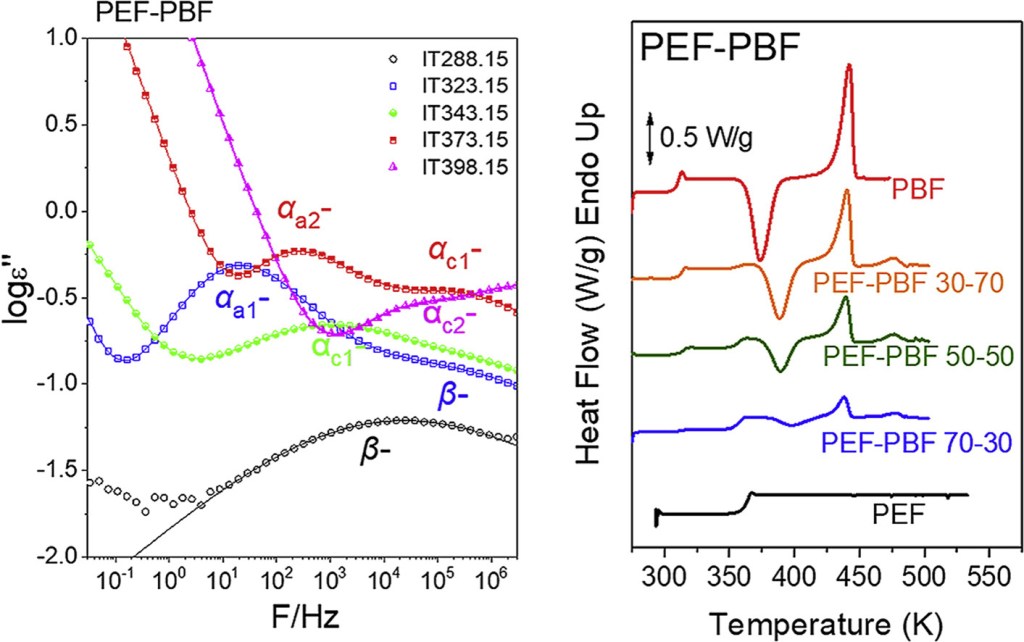 Abstract: Polyesters from 2,5-furandicarboxylic acid are considered as biobased alternatives to their terephthalate counterparts. This work is focused on polymer blends comprised of furan-based polyesters differing by one or two methylene groups in their repeat units. Blends of Poly(ethylene 2,5-furandicarboxylate) (PEF) and poly(propylene 2,5-furandicarboxylate) (PPF) displayed a single composition-dependent glass temperature (Tg). Dielectric spectroscopy results revealed dynamically homogeneous mixtures when the backbones differ by a single methylene unit and dynamically heterogeneous mixtures when they differ by two methylene units. The most interesting finding was the single segmental dynamics in the PEF-PPF and poly(butylene furanoate)-poly(propylene furanoate) (PBF-PPF) blends. For comparison, homologous terephthalate blends were also investigated. Finally, reactive blending was applied in PEF-PBF blends and enhanced compatibility was achieved even after short times due to transesterification reactions at elevated temperatures. With increasing duration of melt-mixing the thermodynamic miscibility between PEF and PBF increased and ultimately a random copolymer was obtained.