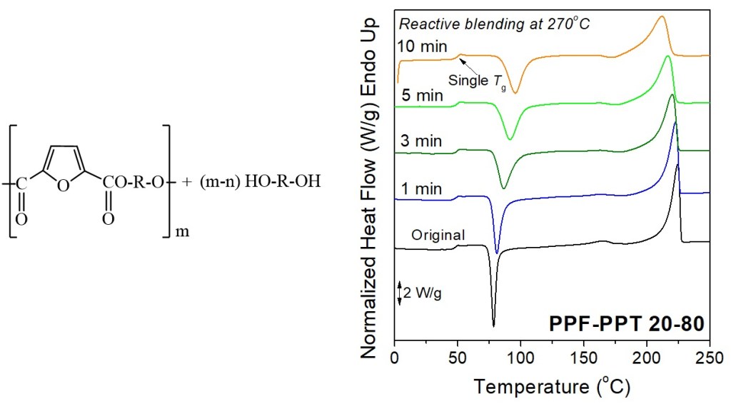 Abstract: Polymers from renewable resources and especially strong engineering partially aromatic biobased polyesters are of special importance for the evolution of bioeconomy. The fabrication of polymer blends is a creative method for the production of tailor-made materials for advanced applications that are able to combine functionalities from both components. In this study, poly(alkylene furanoate)/poly(alkylene terephthalate) blends with different compositions were prepared by solution blending in a mixture of trifluoroacetic acid and chloroform. Three different types of blends were initially prepared, namely, poly(ethylene furanoate)/poly(ethylene terephthalate) (PEF/PET), poly(propylene furanoate)/poly(propylene terephthalate) (PPF/PPT), and poly(1,4-cyclohenedimethylene furanoate)/poly(1,4-cycloxehane terephthalate) (PCHDMF/PCHDMT). These blendsโ miscibility characteristics were evaluated by examining the glass transition temperature of each blend. Moreover, reactive blending was utilized for the enhancement of miscibility and dynamic homogeneity and the formation of copolymers through transesterification reactions at high temperatures. PEFโPET and PPFโPPT blends formed a copolymer at relatively low reactive blending times. Finally, poly(ethylene terephthalate-co-ethylene furanoate) (PETF) random copolymers were successfully introduced as compatibilizers for the PEF/PET immiscible blends, which resulted in enhanced miscibility.