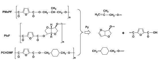 Abstract: In the present study, three new biobased furanoate polyesters with potential use in food packaging applications, named poly(isosorbide furanoate) (PIsF), poly(methyl-propylene furanoate) (PMePF) and poly(1,4-cyclohexane-dimethylene 2,5-furanoate) (PCHDMF) were synthesized. As monomers for the preparation of the polyesters, 2,5-furandicarboxylic acid (FDCA) and diols with irregular or complicated structure were used, including isosorbide (IS), 2-methyl-1,3-propanediol (MPD) and 1,4-cyclohexane-dimethanol (CHDM). The polymerization process was carried out via melt polycondensation method. The structural characteristics and thermal behavior of the polymers were studied. The kinetic fragility of the amorphous phase of the polymers was evaluated. The thermal degradation was studied by means of thermogravimetry and a pyrolysis Py-GC/MS (Pyrolysis-Gas Chromatography/Mass Spectroscopy) system to estimate the degradation mechanism.