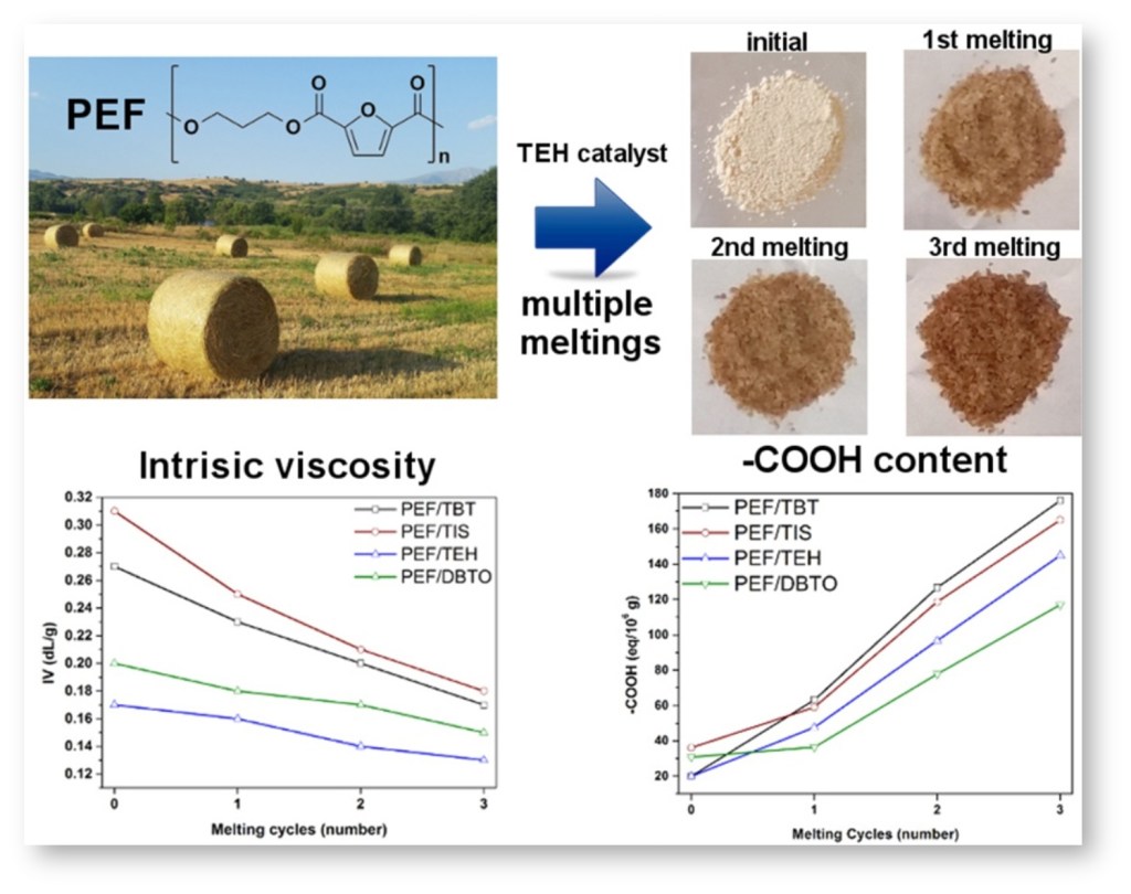 Abstract: In the present work, poly(ethylene furanoate) (PEF) was synthesized via two-stage melt polycondensation process, using four different catalysts, namely tetrabutyl titanate (TBT), titanium(IV) isopropoxide (TIS), tin(II) 2-ethylhexanoate (TEH) and dibutyltin(IV) oxide (DBTO). In all reactions, 2,5-dimethylfuran-dicarboxylate (DMFD), ethylene glycol (EG) (1:2 molar ratio) and 400 ppm of catalyst were used. The effect of these catalysts on the remelting and decomposition mechanism of PEF was studied. All polyesters were remelted up to three times, and for every melting cycle the intrinsic viscosity (IV) values and the carboxyl end group content were measured. It was found that after every melting, the IV was reduced while the COOH number was increased. Also, all samples have been studied with Fourier Transformed-Infrared Spectroscopy (FTIR), differential scanning calorimetry (DSC) and thermogravimetric analysis (TGA) techniques. It was found that the molecular weight reduction also affects the thermal properties of the polyesters. The decomposition mechanism of the prepared polyesters was studied using pyrolysis-gas chromatography/mass spectroscopy (Py-GC/MS).