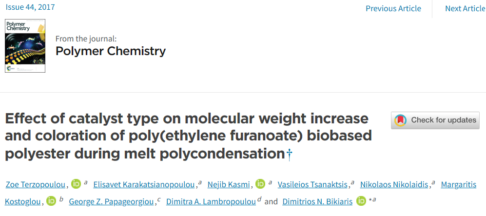 [2] Z. Terzopoulou, E. Karakatsianopoulou, N. Kasmi, V. Tsanaktsis, N. Nikolaidis, M. Kostoglou, G.Z. Papageorgiou, D.A. Lambropoulou, D.N. Bikiaris*. Effect of catalyst type on molecular weight increase and coloration of poly(ethylene furanoate) biobased polyester during melt polycondensation, Polymer Chemistry. 2017, 8, 6895-6908. LINK (IF “2021”: 5.364)