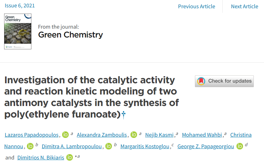 [22] L. Papadopoulos, A. Zamboulis, N. Kasmi, M. Wahbi, C. Nannou, D. A. Lambropoulou, M. Kostoglou, G. Z. Papageorgiou, D. N. Bikiaris*. Investigation of the catalytic activity and reaction kinetic modeling of two antimony catalysts in the synthesis of poly(ethylene furanoate). Green Chemistry 2021, 23, 2507-2524 (IF “2021”: 11.034) LINK