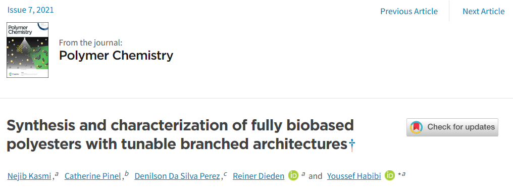 [21] N. Kasmi, C. Pinel, D. Da Silva Perey, R. Dieden, Y. Habibi. Synthesis and characterization of fully biobased polyesters with tunable branched architectures. Polymer Chemistry 2021, 12, 991-1001 (IF “2021”: 5.364). LINK