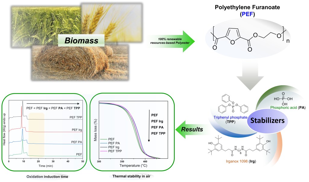Abstract: Polyesters based on 2,5-furan dicarboxylic acid are a new class of biobased polymers with properties superior of those of their fossil-based homologues. However, similarly to poly(ethylene terephthalate) (PET), poly(ethylene 2,5-furan dicarboxylate) (PEF) degrades during its thermal processing and as a result its molecular weight drops, and discoloration occurs. This is mainly attributed to thermal and thermo-oxidative degradation reactions. The addition of several types of thermal stabilizers during the synthesis or the processing of thermoplastic polyesters is a common practice. In this work, a commercial phenolic antioxidant (Irganox 1098), and two phosphorus-containing thermal stabilizers (phosphoric acid and triphenyl phosphate) were added in PEF polyester during synthesis with the use of antimony acetate catalyst. The effect of these additives on the molecular weight, thermal properties, thermal, thermo-oxidative stability and physical aging of PEF was evaluated. It was found that all additives slightly improved the thermal stability of PEF, with phosphoric acid and mainly triphenyl phosphate being the most efficient ones.