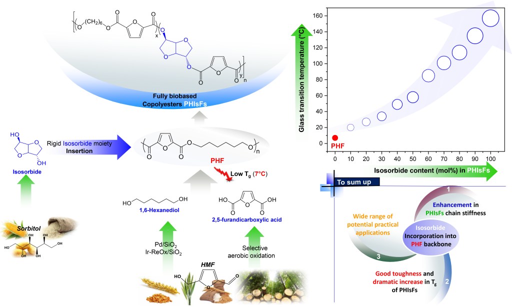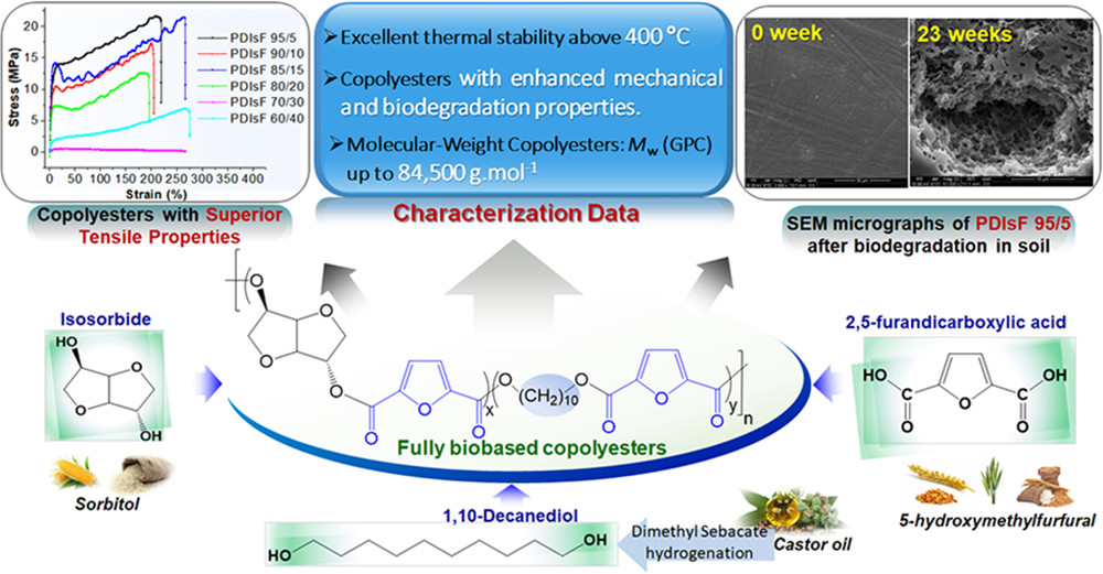 Abstract: Here an effective solution for overcoming the low glass transition temperature (Tg) of poly(hexamethylene 2,5-furan dicarboxylate) (PHF), a fully biobased polyester derived from dimethylfuran-2,5-furan-dicarboxylate (DMFD) and 1,6-hexanediol (1,6-HD), is proposed that uses isosorbide (Is) as a bicyclic rigid diol comonomer. Incorporating this sugar-derived diol with a broad scope content (3โ90โฏmol%) into PHF macromolecular chain, by melt polycondensation and using titanium (IV) isopropoxide (TTIP) catalyst, results in the synthesis of highly heat-resistive poly(hexamethylene-co-isosorbide-2,5-furandicarboxylates) copolyesters (PHIsF). The chemical structure and composition of the prepared 100% renewable resources-based materials were confirmed in detail by 1H NMR and FTIR spectroscopies. Random microstructures were obtained for PHIsF samples, when Is content exceeds 40โฏmol%. As revealed by Wide-Angle X-ray Diffraction (WAXD) patterns, increase of IsF content in the copolymers leads to amorphous materials. The latter exhibited an excellent thermal stability up to 360โฏยฐC and very variable Tg values oscillating from 10 to 135โฏยฐC depending on the comonomer ratio, in which it gradually increases with increasing of Is feed content. Results found herewith showed that the high stiff building block Is can be used as an effective control parameter to spectacularly enhance the thermal properties of polymers, particularly the glass transition temperature. Taking advantage of their features, PHIsF have the potential to serve as promising fully biobased amorphous materials for practical applications that demand high Tg values.