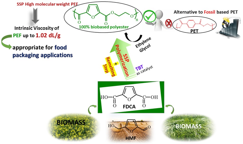 Abstract: The goal of this study was to synthesize, through a facile strategy, high molecular weight poly(ethylene furanoate) (PEF), which could be applicable in food packaging applications. The efficient method to generate PEF with high molecular weight consists of carrying out a first solid-state polycondensation under vacuum for 6 h reaction time at 205 ยฐC for the resulting polymer from two-step melt polycondensation process, which is catalyzed by tetrabutyl titanate (TBT). A remelting step was thereafter applied for 15 min at 250 ยฐC for the obtained polyester. Thus, the PEF sample was ground into powder, and was then crystallized for 6 h at 170 ยฐC. This polyester is then submitted to a second solid-state polycondensation (SSP) carried out at different reaction times (1, 2, 3.5, and 5 h) and temperatures 190, 200, and 205 ยฐC, under vacuum. Ultimately, a significant increase in intrinsic viscosity is observed with only 5 h reaction time at 205 ยฐC during the second SSP being needed to obtain very high molecular weight PEF polymer greater than 1 dL/g, which sufficient for manufacturing purposes. Intrinsic viscosity (IV), carboxyl end-group content (โCOOH), and thermal properties, via differential scanning calorimetry (DSC), were measured for all resultant polyesters. Thanks to the post-polymerization process, DSC results showed that the melting temperatures of the prepared PEF samples were steadily enhanced in an obvious way as a function of reaction time and temperature increase. It was revealed, as was expected for all SSP samples, that the intrinsic viscosity and the average molecular weight of PEF polyester increased with increasing SSP time and temperature, whereas the number of carboxyl end-group concentration was decreased. A simple kinetic model was also developed and used to predict the time evolution of polyesters IV, as well as the carboxyl and hydroxyl end-groups of PEF during the SSP.
