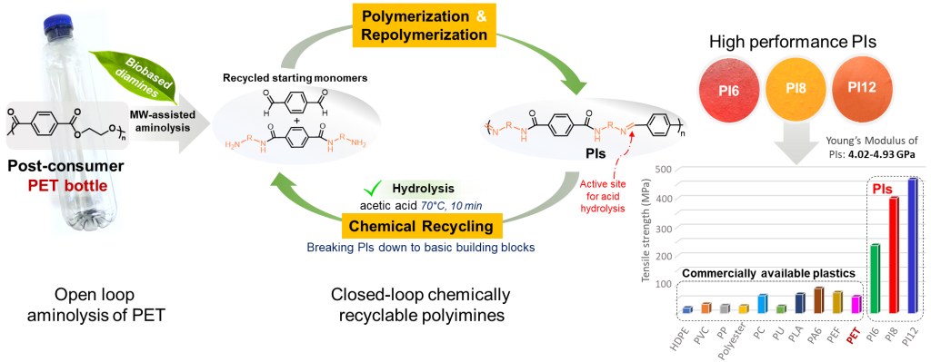 Abstract: Intriguing high-performance polyimines (PI) were designed from diamines recovered by open-loop recycling of postconsumer PET bottles by microwave-assisted aminolysis. These new PIs had excellent thermal properties (Tm = 226โ286 ยฐC, Tg = 88โ148 ยฐC, heat resistance up to 327 ยฐC) and super-high toughness and strength with Young’s modulus of 4.02โ4.93 GPa and tensile strength of 237โ467 MPa, both significantly higher compared with common engineering plastics. The synthesized PIs also demonstrated recyclability โon demandโ to original building blocks via mild and ultrafast acetic acid catalysed hydrolysis (70 ยฐC for 10 min). Furthermore, the recovered monomer mixture was directly repolymerizable providing attractive closed-loop polymer-to-polymer recyclability under extremely mild conditions. These high performance thermoplastics, with easily tunable properties by selection of diamine used for aminolysis, in combination with closed-loop chemical recyclability have great promise as next-generation circular materials, designed from recycled plastics waste, for a wide property and application range.