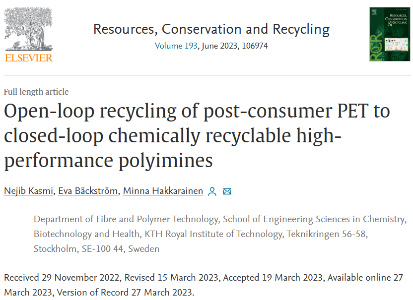 [26] N. Kasmi, E. Bรคckstrรถm, M. Hakkarainen*. Open-loop recycling of post-consumer PET to closed-loop chemically recyclable high-performance polyimines, Resources, Conservation & Recycling 2023, 193, 106974 (IF: 13.716). LINK