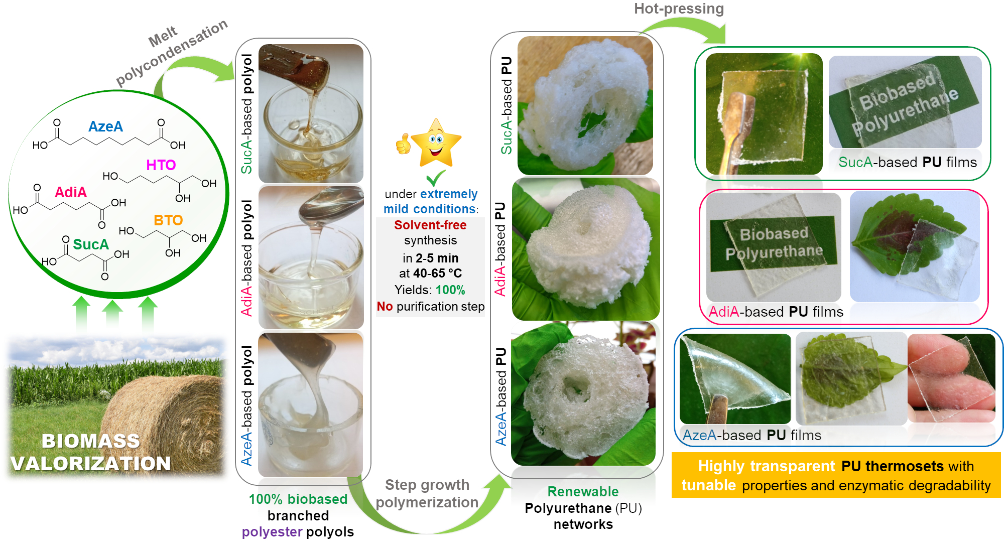 Abstract: Polyols made entirely from biomass could play a substantial role in producing greener polyurethanes (PU) with lower environmental impacts. Here, six fully biobased branched polyester polyols derived from hemicellulosic sugars and dicarboxylic acids were prepared by melt polycondensation and further utilized for the synthesis of twelve highly transparent and malleable PU thermosets. The latter were prepared by solvent-free step growth polymerization under extremely mild reaction conditions, easily applicable industrially. This included a very short reaction time (125-335 s), low operating temperatures (40-65 ยฐC) and excellent yields (100%). In addition, no purification step was required. All the obtained PUs possessed very good thermal stability exceeding 235 ยฐC, Tg (3.6-70.4 ยฐC), and a broad hot-pressing window up to 192 ยฐC above respective Tg. These amorphous materials demonstrated a wide range of stress-strain behaviors, from hard to ductile, with elongation at break and tensile strength appearing in the 15-188% and 3.3-31.1 MPa range, respectively; comparable or superior to common commercially available fossil-based PU thermosets in the market. Enzymatic hydrolysis behaviour of the synthesized PUs was assessed using lipases from Candida rugosa and Aspergillus niger. All PUs showed some susceptibility to enzymatic attack, with a maximum mass loss up to 35% after 30 days. Most importantly, it was found that compositional control by tailoring of the length of the diacid unit in the branched polyols backbone and/or chemical crosslinking degree of the resulting PU networks can be used as a practical tool to effectively โon demandโ tune thermal properties, mechanical performance and enzymatic degradation rate. Taking advantage of these promising features in combination with the optical transparency, the developed polyurethane thermosets with easily adjustable properties show great potential as innovative materials for a wide applications range.